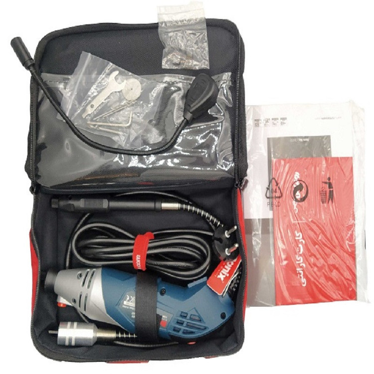 ارائهشده در یک کیف برزنتی مقاوم همراه متعلقات زیر: یک شلنگ انعطافپذیر، یک چراغ LED مغناطیسی و متعلقات کاربردی متعدد برای سنبادهزنی، برش، صیقلدادن، کندهکاری، پرداخت و تمیزکردن سطوح مختلف چوبی و فلزی