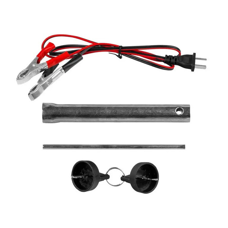 دو عدد دوشاخه برق، 1 عدد آچار شمع، 1 عدد میله، یک عدد خروجی 12 ولتDC