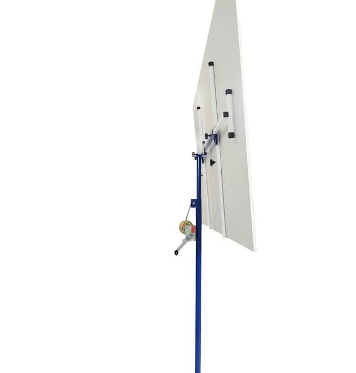 جک بالابر پانل کناف سقفی یکی از ابزار پر کاربرد مخصوص کناف کاران می باشد. این وسیله برای بالا بردن پانل ها جهت نصب و پیچ کردن آن ها به سازه های سقفی استفاده می شود.ویژگی این جک قابلیت چرخش آن به صورت عمودی و افقی میباشد به صورتی که جهت سهولت بتوان پانل را در ارتفاع پایین تر روی آن گذاشت و سپس آن را به حالت افقی برگرداند. همچنین کمک می کند پیچ کردن پانل ها در تراز دلخواه توسط یک نفر به راحتی انجام شود.همچنین شاخکهای قابل تنظیم مباشد که پانل از عرض 70 سانتیمتر تا پنل کامل میتوان روی ان قرار داد. این محصول دارای بدنه فولادی بسیار مقاوم و مستحکم با کاربرد بسیار آسان میباشد. همچنین کمترین ارتفاع آن160سانتی متر و بیشترین ارتفاعی که میتواند پانل را بالا مستقر کند نیز 420 سانتی متر می باشد. همچنین از این جک به عنوان جک بالابر MDF ، چوب و کابینت استفاده میگردد.این دستگاه به شکلی طراحی شده است که قطعات ان کاملا از همدیگر جدا میشوند و دباره مونتاژمیشودجهت حمل و نقل اسان