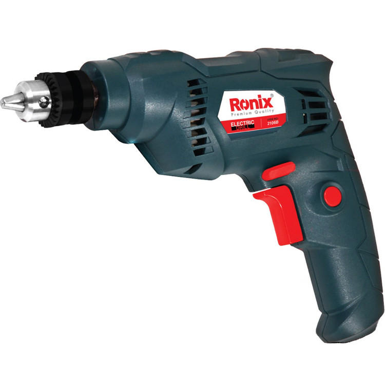 دریلها ازجمله ابزارهای کاربردی محسوب میشوند که وجود آنها در هر خانهای موردنیاز است. این دستگاهها انواع بسیار گوناگونی دارند و برای انجام کارهای مختلفی مورداستفاده قرار میگیرند. درصورتیکه به شکلی حرفهای با دریل کار نمیکنید، میتوانید دریلی ساده را تهیه کرده و در مواقع موردنیاز از آن استفاده کنید. محصولی که در تصویر مشاهده میکنید برای چنین منظوری بسیار مناسب است. این دستگاه دریل شرکت «رونیکس» (Ronix) است که تحت عنوان «2106B» تولید میشود. این دریل توانی برابر 400 وات داشته و با برق شهری کار میکند. سرعت گردش این دستگاه 3500-0 دور بر دقیقه بوده و با کمک کلیدی میتوانید جهت چرخش آن را تغییر دهید. این دستگاه وزن سبکی برابر 1 کیلوگرم دارد و بر اساس استاندارد CE (استاندارد اروپا) تولید میشود. شرکت رونیکس برای راحتی بیشتر کاربر، این دستگاه را به قفل سوییچ مجهز کرده است. با کمک این کلید، دیگر نیازی به نگهداشتن شاسی دریل برای سوراخکاری ندارید، سهنظام دستگاه بهطور مداوم میچرخد و شما با تسلط و قدرت بیشتری میتوانید عمل دریلکاری را انجام دهید. سهنظام این دریل از نوع 6.5 میلیمتری بوده و برای باز و بسته کردن مته باید از آچار استفاده کنید. این محصول در برابر گردوغبار نیز عایق است.