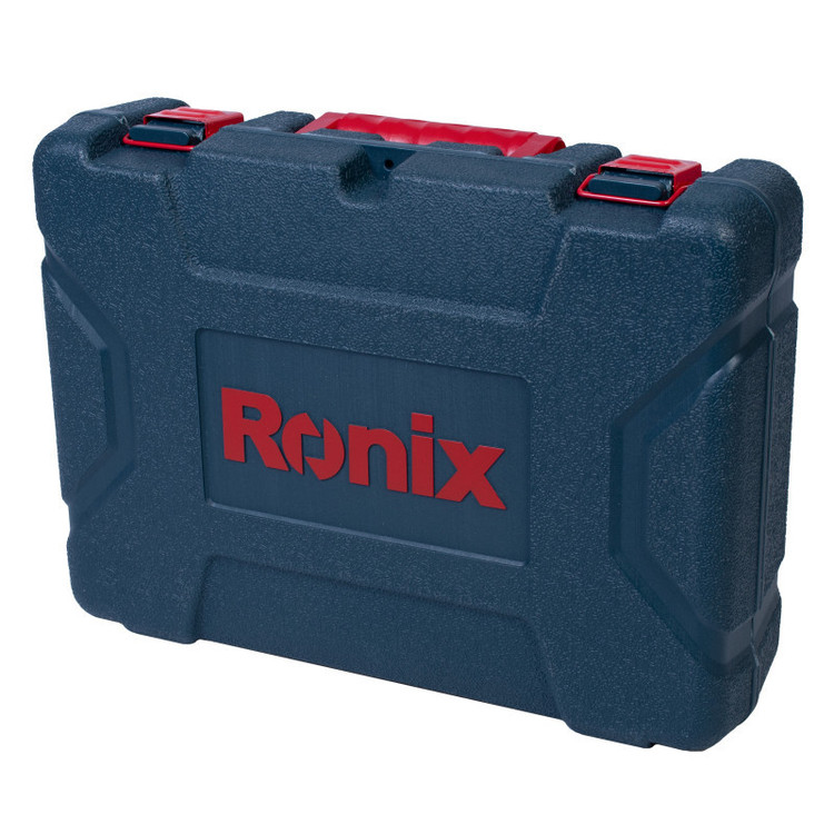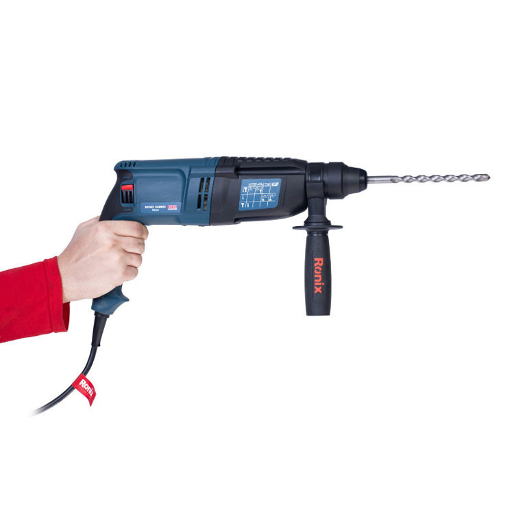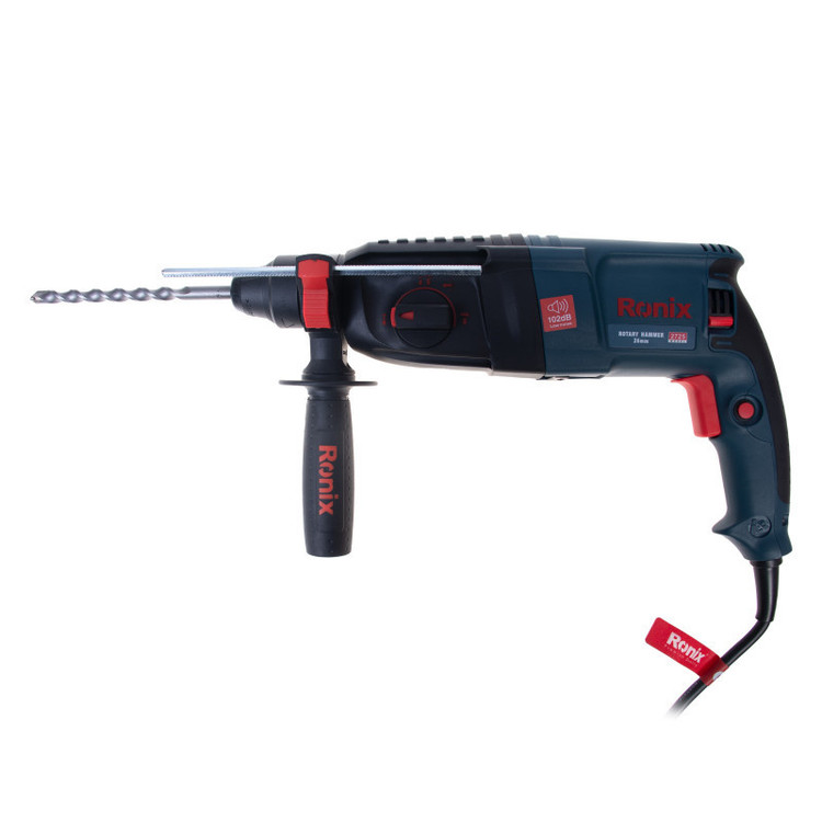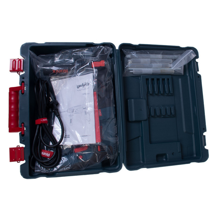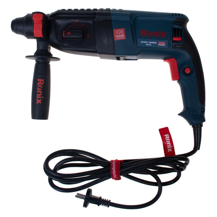 بتن کن برقی رونیکس مدل 2725 یکی از نمونههای با کیفیت و قدرتمند موجود در بازار کشور است. این دستگاه دارای موتور قدرتمند 850 واتی است که به آن این امکان را داده تا بتواند انواع سطوح و قطعات اعم از سنگ، چوب و فلز را چکشکاری یا سوراخکاری کند.بتن کن 2725 رونیکس سه حالت عملکردی دارد: حالت سوراخکاری، حالت چکشی و حالت همزمان سوراخکاری و چکشی. بر روی بدنهی این ابزار، یک سوئیچ سه وضعیته تعبیه شده که با چرخاندن آن میتوان وضعیت دستگاه را بر روی یکی از حالات فوق قرار دارد. وجود این سه وضعیت، کارایی دستگاه را تا حد زیادی بالا برده و به کاربر این امکان را داده تا بنا به نوع کار خود، از دستگاه برای چکشکاری یا سوراخکاری استفاده کند.این محصول رونیکس، توان مناسبی در وارد کردن نیرو به سطح کار دارد. حداکثر سرعت گردش بتن کن سه کاره رونیکس به 1200 دور در دقیقه میرسد و قادر است در هر دقیقه، حداکثر 5500 ضربه با انرژی 3.5 ژول به سطح کار وارد کند. متههای مناسب این دستگاه متههای با سایز 150× 7، 150× 8، 150× 10 و 150× 12 میلیمتر هستند.سیستم مته گیر این دریل بتن کن، به صورت SDS-Plus است و برای متههایی مناسب است که دنباله یا متهگیر آنها 4 شیار است. این قسمت مته گیر رونیکس روکش پلاستیکی دارد تا هم دوام آن افزایش یاید و هم تعویض مته، به شکلی سریع و راحت انجام شود.